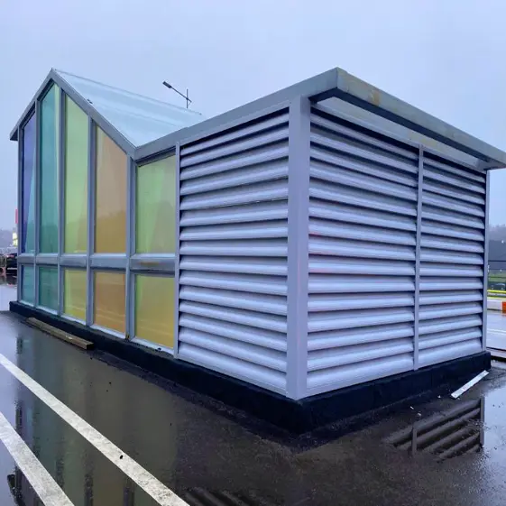 Вентиляционная шахта оформлена ламелями Еврожалюзи в цвете RAL 7004 Серый покрытие полиэстер односторонний. Такое решение придаёт конструкции аккуратный и стильный внешний вид, обеспечивает приток воздуха и защиту от внешних воздействий. Строгий серый цвет гармонично сочетается с архитектурой городской среды, создавая аккуратный фасадный акцент.